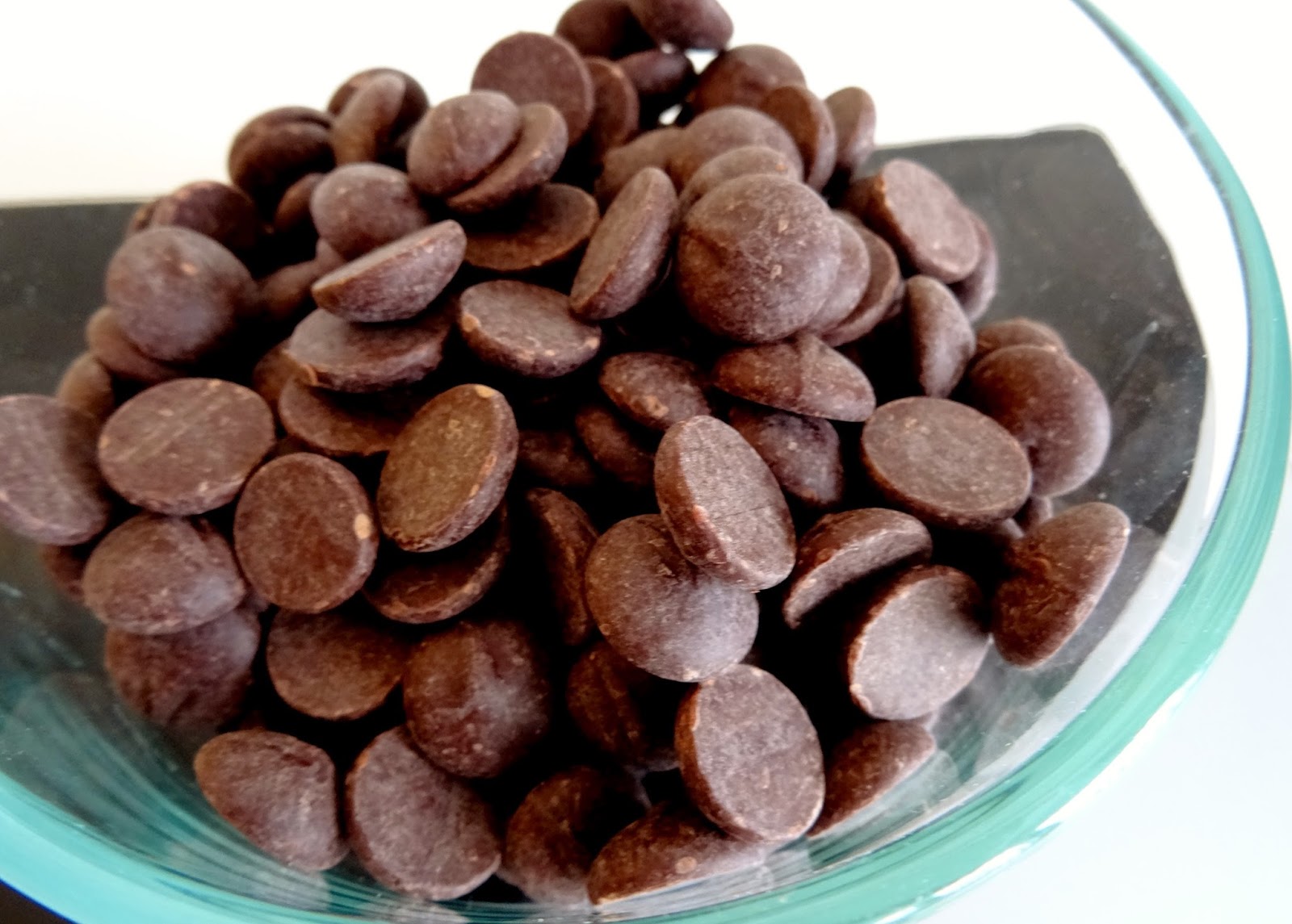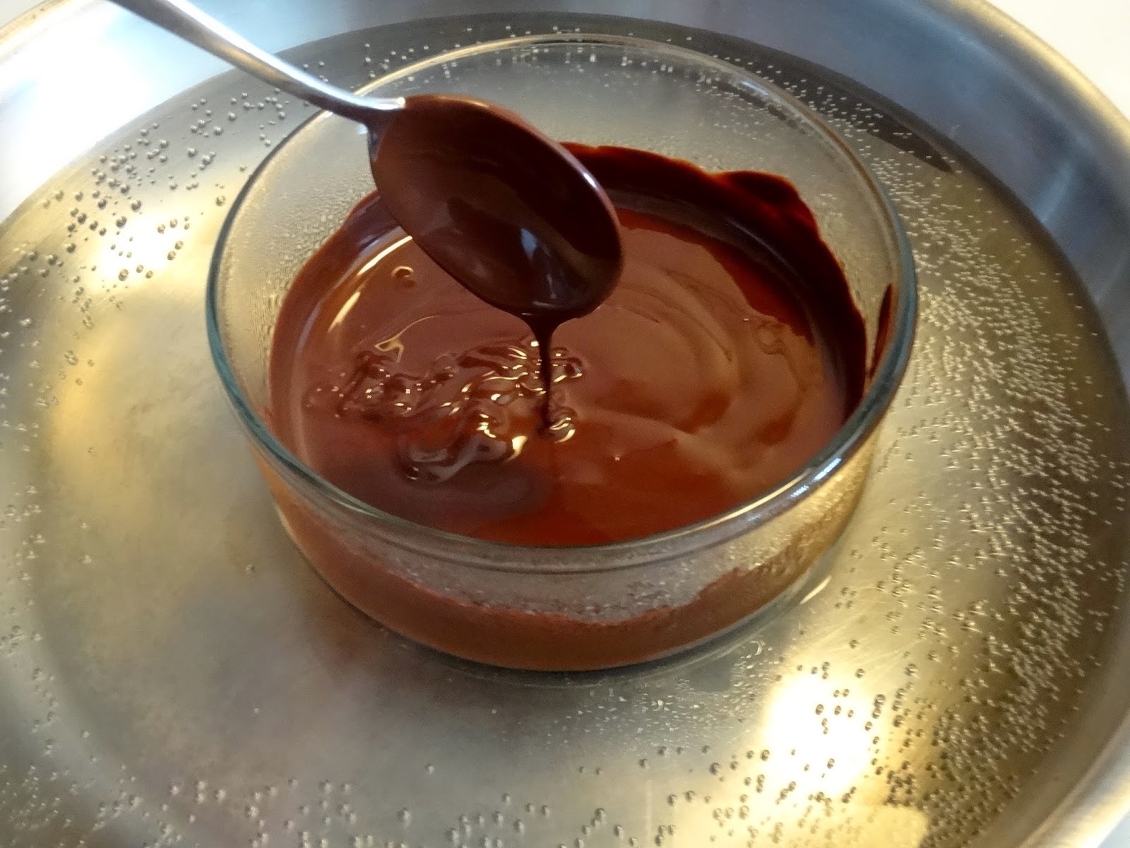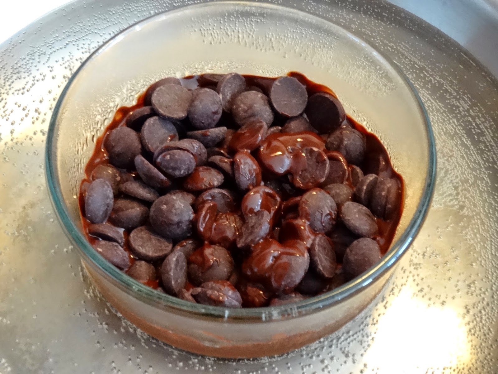 1. 把巧克力隔著熱水用小火溫熱至完全溶掉。我用60%的巧克力 (Ghirardelli Chocolate 60% Caocao Bittersweet Chocolate),是上次做巧克力蛋糕剩下來的。