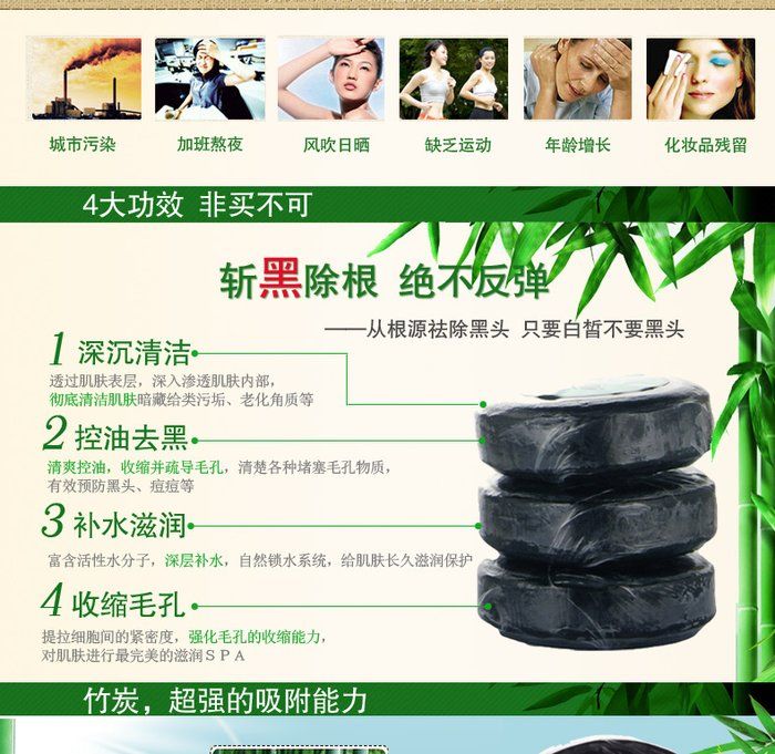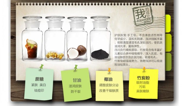 竹碳粉(精制竹碳成分,吸附皮肤污垢,有效清除肌肤多余油脂.)、椰子油精华(保湿、滋润肌肤)天然洁肤成分,令肌肤清爽,润滑
