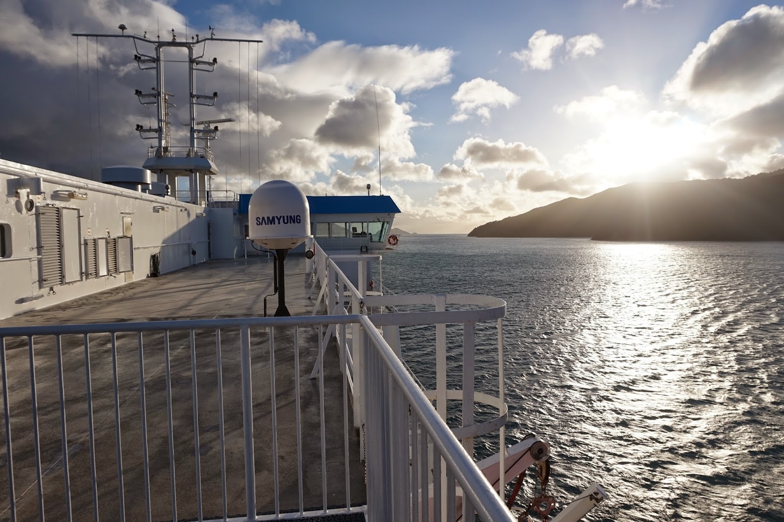 放下行李后还来不及休息就立马到船上的最高点去。船开始起航咯~ 眺望着慢慢远去的 Picton town,当时心里有点舍不得,不知道还会不会有机会到这迷人的南岛来,再见了 south island。