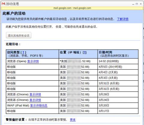 Google“不作恶”的原则,让很多人选择了Gmail作为自己的主邮箱。来自中国大陆的用户,要克服GFW对Gmail服务的间歇性干扰或翻墙,才能使用Gmail。主邮箱是如此的重要,因此本文将详细介绍如何检查Gmail设置,来确保自己的Gmail安全。 检查账户活动信息 使用Gmail,首先要了解自己帐户的活动状况,建议至少每星期检查一次。在Gmail邮件标题列表的最下方,可以发现“上次帐户活动时间:xx(时间)前 详细信息”字样,点击“详细信息”,Gmail将在弹出的窗口中显示最近的帐户活动状况。如下图所示: