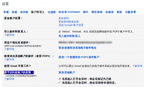 如果帐户使用者没有设置过邮件转发,在“转发”这个位置将会显示空白;如果没有设置转发却显示已经存在转发地址,则可以肯定邮箱已经被成功入侵,需要马上删除转发并更改密码。 POP下载及IMAP访问也可能被入侵者用来查看邮件而不会导致邮件查看状态的改变,但会在帐户的活动信息留下痕迹。如果不使用Outlook、Foxmail等客户端及iPad、iPhone等移动设置访问Gmail或将帐号导入到其他帐号当中,建议停用POP及IMAP。 账户被授权 最后,还要不定期检查帐户的授权。进入设置界面后,点击“账户和导入”标签: