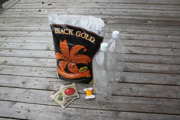材料:大的饮料瓶子、棉绳、土壤和种子。