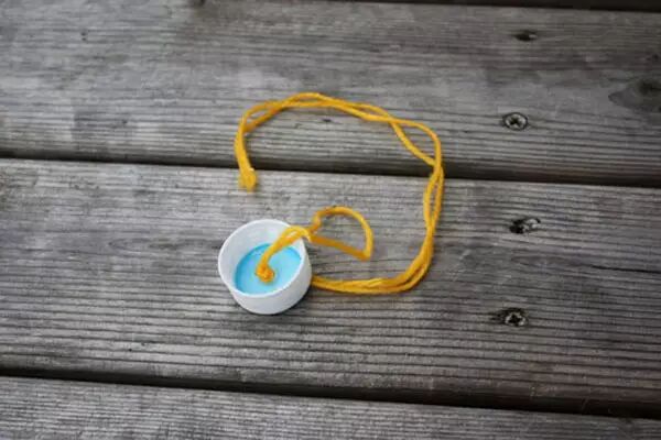 2把绳子打个结,穿过瓶盖。绳子的长度大家自己调节。