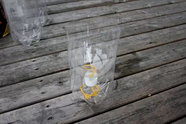 1把瓶子对半切开。然后在瓶盖上钻一个孔。