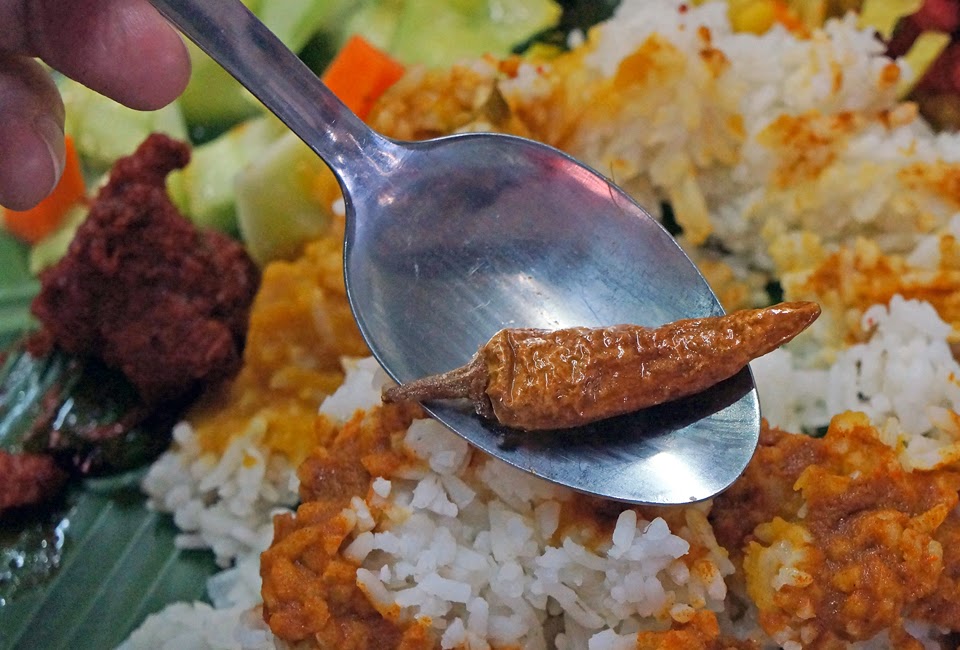 还没完哦,接着印度大叔又把左上角的两条炸辣椒和长豆sambal加入我们的香蕉叶中。