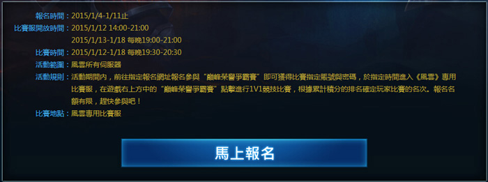G妹遊戲《風雲》巅峰荣誉争霸赛:http://www.gm99.com/event/fy_tsg/