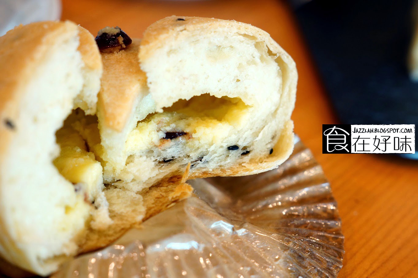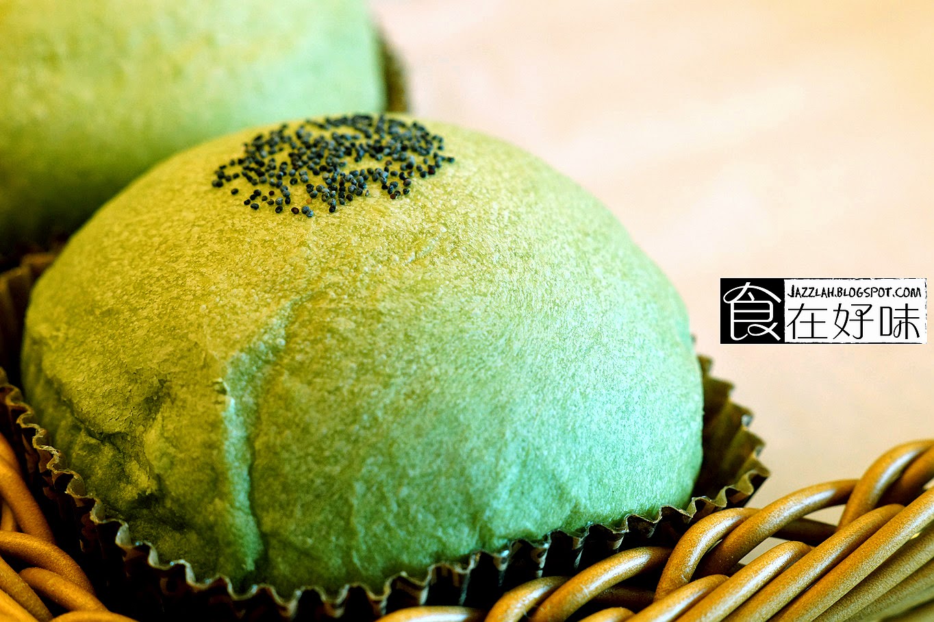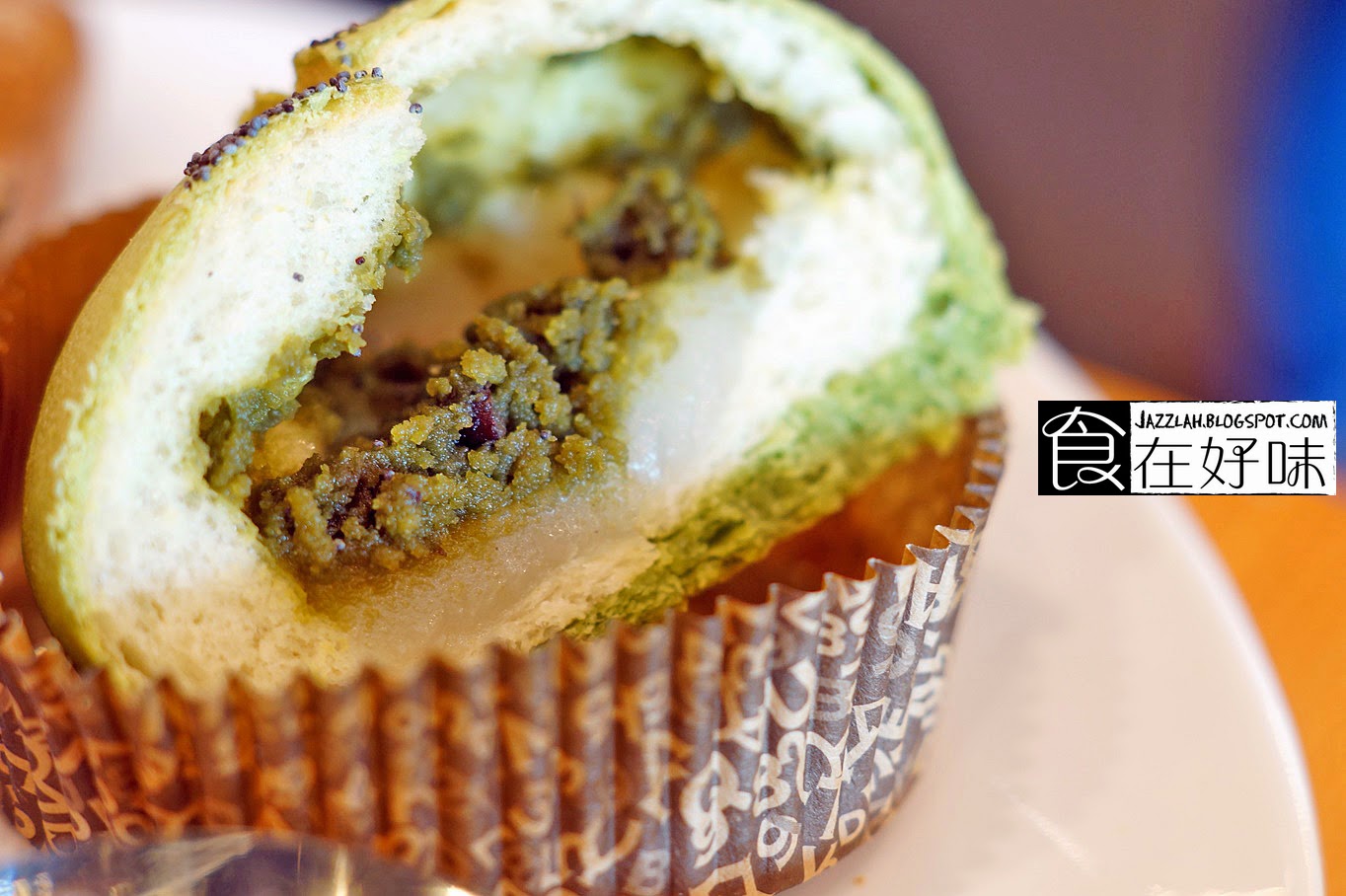 日式抹茶麻糬 Japanese Matcha Mochi【RM3.50】 这个绿色一颗的面包不用说也看得出应该是加入抹茶了 个人超级推荐而且也是热卖的面包类型 面包外层裹着一层抹茶油皮,咬下去时外层一阵幽幽的抹茶风味 而撕开内陷,可以看到内陷有绿茶馅料而馅料底部还有一层麻糬,Chewy Chewy的口感 面包其实非常松软可口,除了年轻人会爱上,也非常适合孩子老人食用