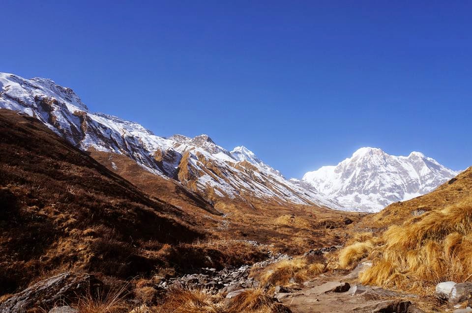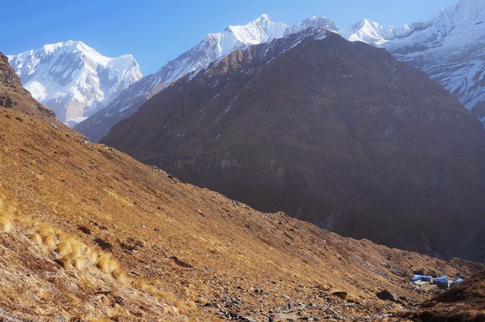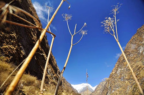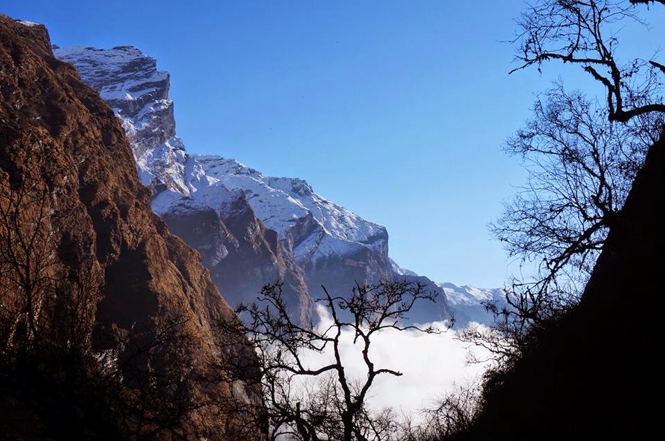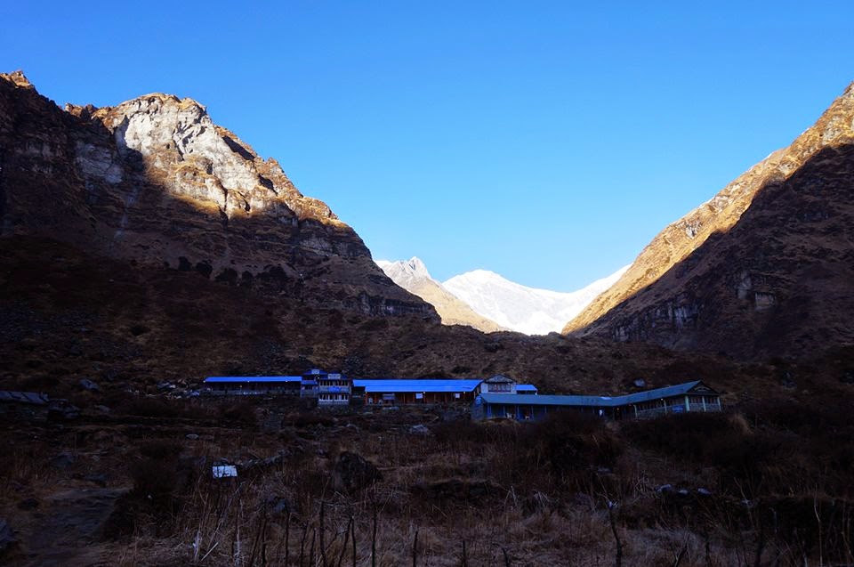 <<25-Nov-2014>> (徒步第四天) 睡醒時發現DOVAN這里的凌晨已蠻冷的(海拔2500M以上了), 換上另一件更耐寒的外套大概6AM我走出房間, 往北邊看去, 的確雪山是有,但風景不是很美, 因為兩旁的山(峽谷)都遮了雪山的大部份, 同時我發覺接近雪山後, 雪山容易被旁邊的山遮著! 看來是要到達MBC或ABC才有最正雪山風景看了!