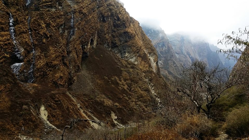 可能要要入冬吧! 第六天下山不久...就太陽收工, 云霧一直濃照著我們! 那個天氣完全和上山時不一樣! 走在峽谷里看見對面的硝壁流著的瀑布都結冰了....