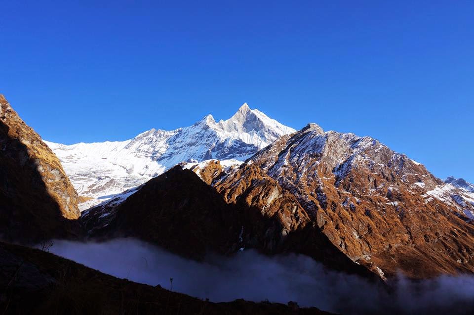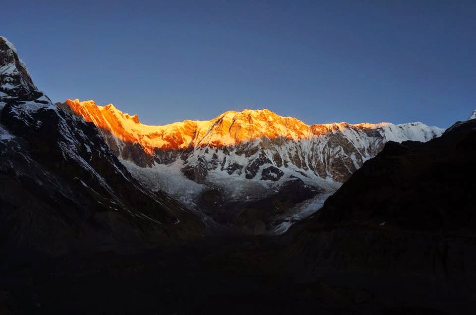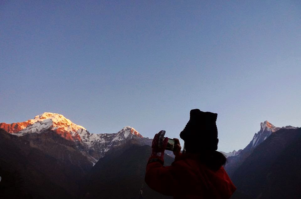 (尼伯尔ABC徒步 "渴望 , 着迷") 第一个凌晨...渴望着越來越近距离的看喜马拉雅山脉! 看着日出那一刻,阳光把Annapurna 南峰(7219 M)照射成金色! 着迷徒步路程不断出现不一样的雪山(一开始只看到鱼尾峰,隔天出现Annapurna南峰.....),仿佛像电影中的主角一个接一个出场! *嘻嘻! 疯狂的我...在每一个登山的凌晨都会熬着寒冷跑出去静静看看雪山! 等待着雪山从白变橙再变金色的过程! 这就是"它们"的魅力!