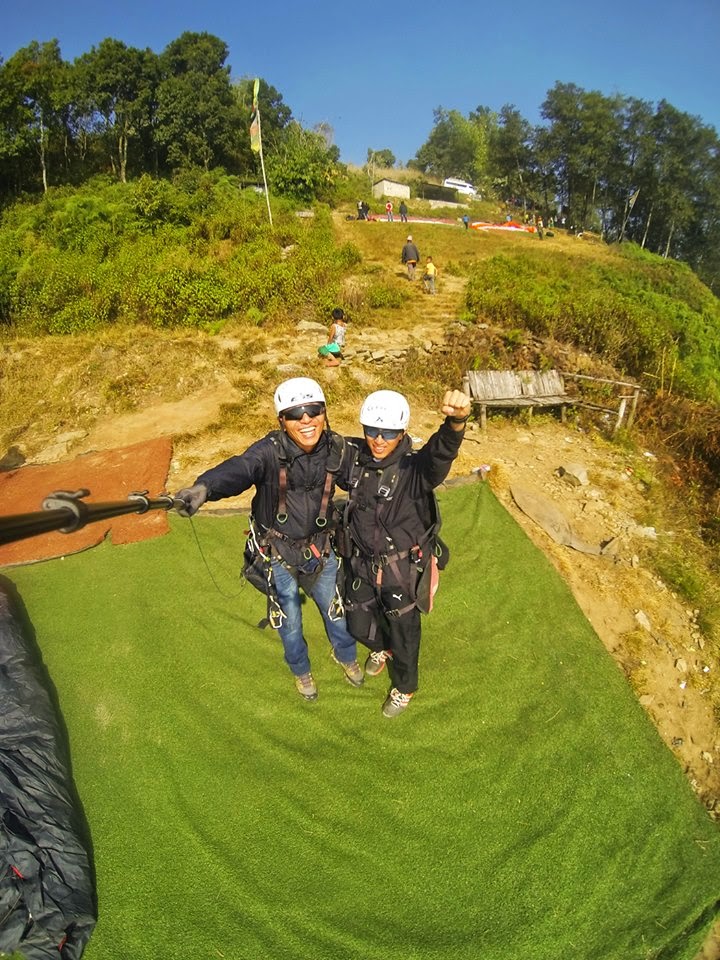 <<30-Nov-2014>> 這天的早滑翔傘公司安排好VAN來再我們! 我們?? 哈哈! 與我一起去體驗滑翔傘的還有我的兩個小徒步隊友! 到達滑翔傘公司簽了那份"生死状"就和那些滑翔傘員一起出發! VAN會把我們載上某個山頂, 然後我們會在山頂滑翔飛出, 降落在護POKHARA的費瓦湖邊的陸地.