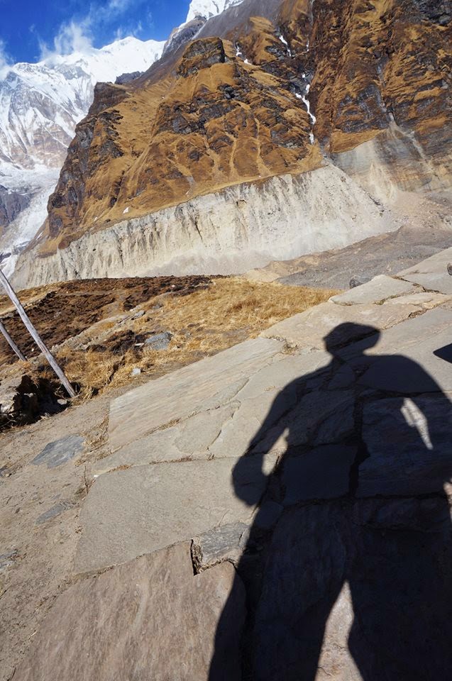 因為ANNAPURNA BASE CAMP就在這堆山的中間, 看山的方向的不同 (360度都是高6000以上的雪山), 所以在這個位置看ANNPURNA I 是在日出變橙/金色, 魚尾峰(MACHHAPUCHHRE)是在日落變橙色!