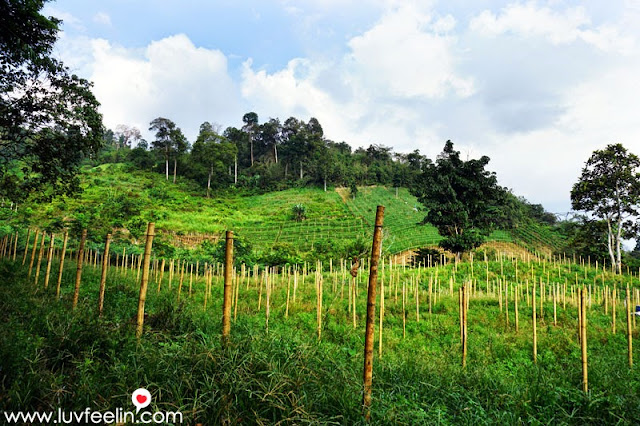 这次穿着不同以往,多了一些双重保护, 例如穿上紧身长裤, 因为据说这里有很多水蛭出没,还套了一件短裤保护屁股,后来玩水的时候可以把短裤脱掉留着换穿。袜子也穿了两层,防止脚趾在下山的时候因撞击鞋头而瘀青,同时长袜子可以覆盖着裤脚, 避免水蛭偷袭等。沿路左右两边都是一片片的菜园,种着各种蔬菜水果,据说幸运的话还可以捡到榴莲 (Durian) 哦!然而在如此秀丽漂亮的风景背后,等着我的就是一段考验体力和耐力的路程。