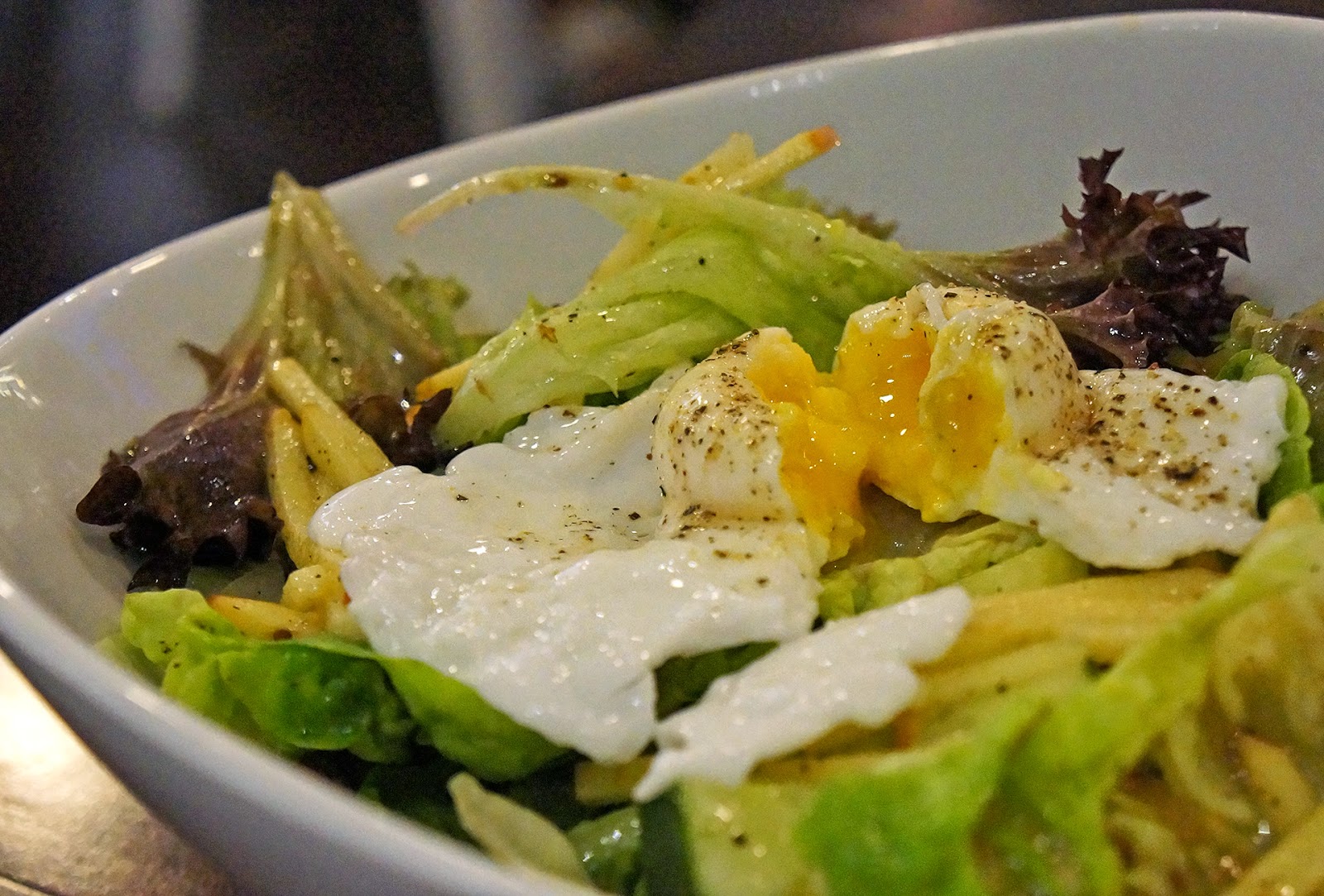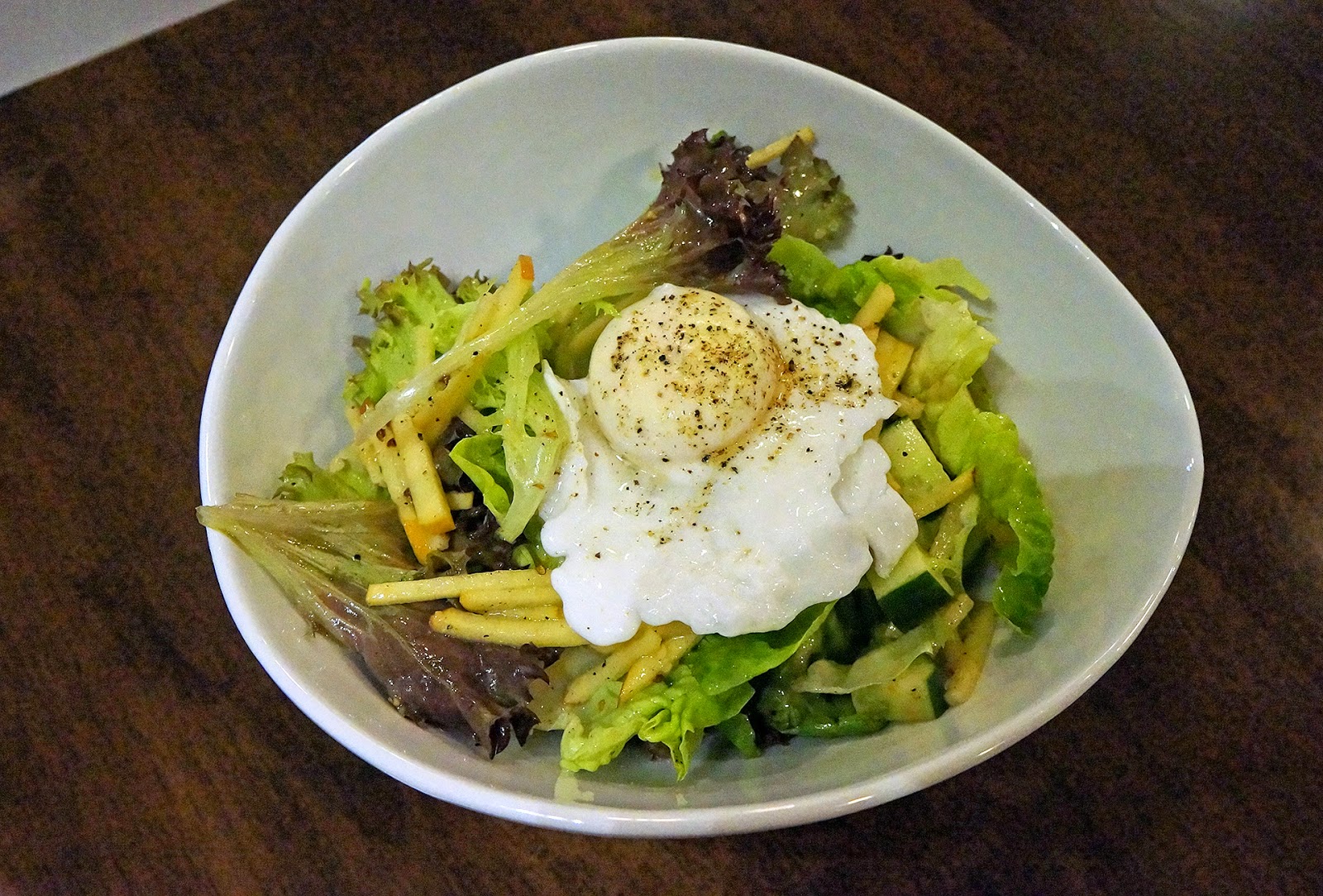 Green Salad中有颗半熟蛋,蛋的卖相煎得有些尴尬,切开后是漂亮的半熟状态。