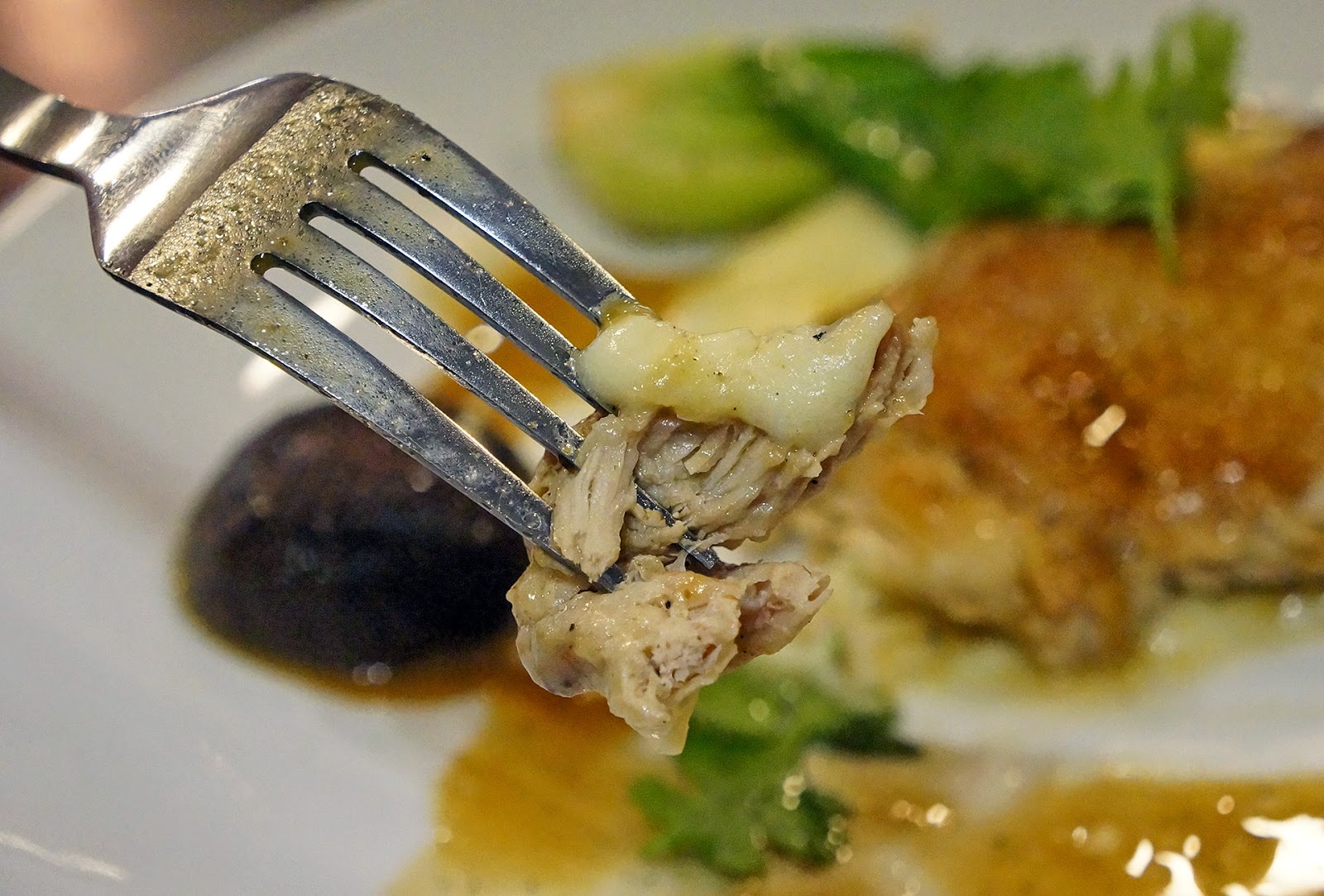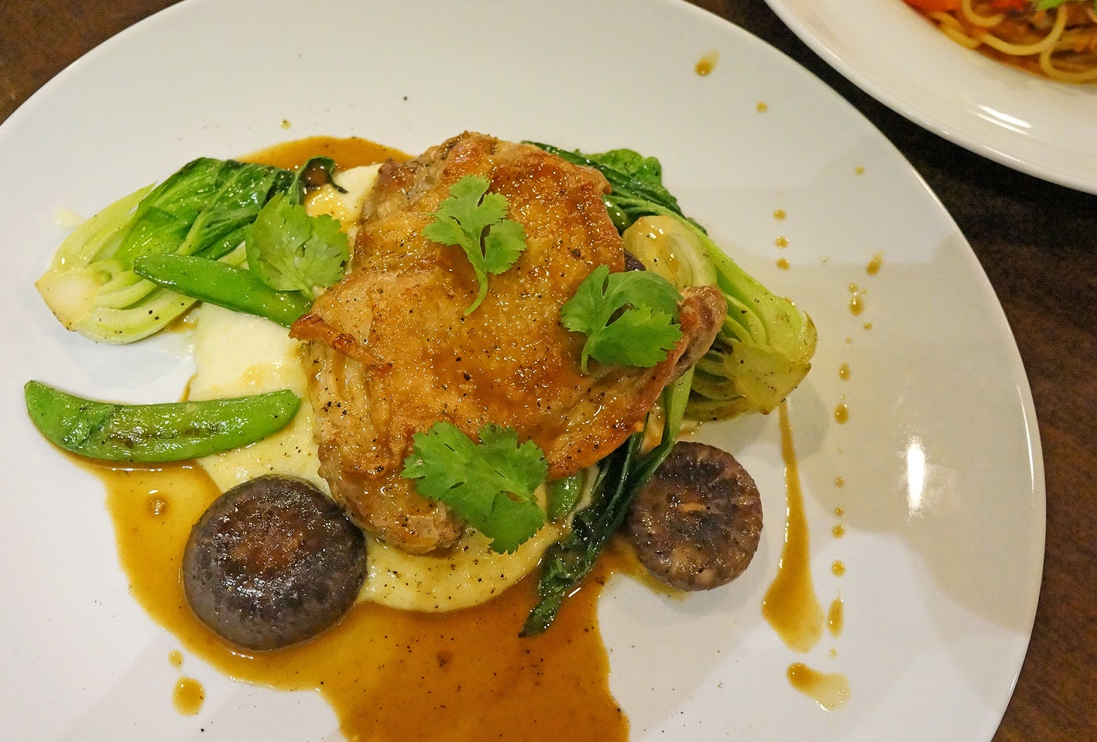 鸡腿肉煎得恰好,带脆的外皮里是仍然Juicy的鸡肉,我尤其喜欢那薯泥,细腻得完全没颗粒状,绵密的口感配着鸡肉吃简直就是完美。附上的两个大蘑菇也炖煮的刚好,唯蔬菜有些许油腻。