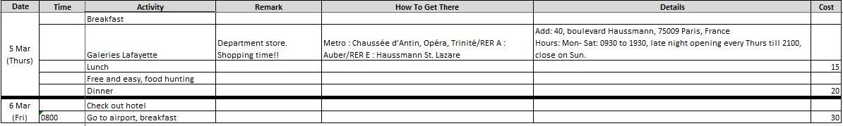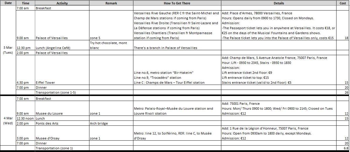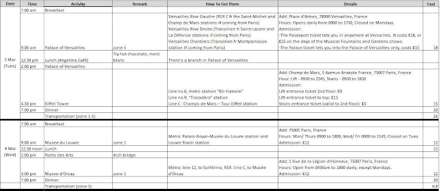 然后就是很重要的行程参考啦。右边是每个活动的消费(欧元计算),不包括住宿、机票及血拼,欧元四百能玩得十分尽兴了。