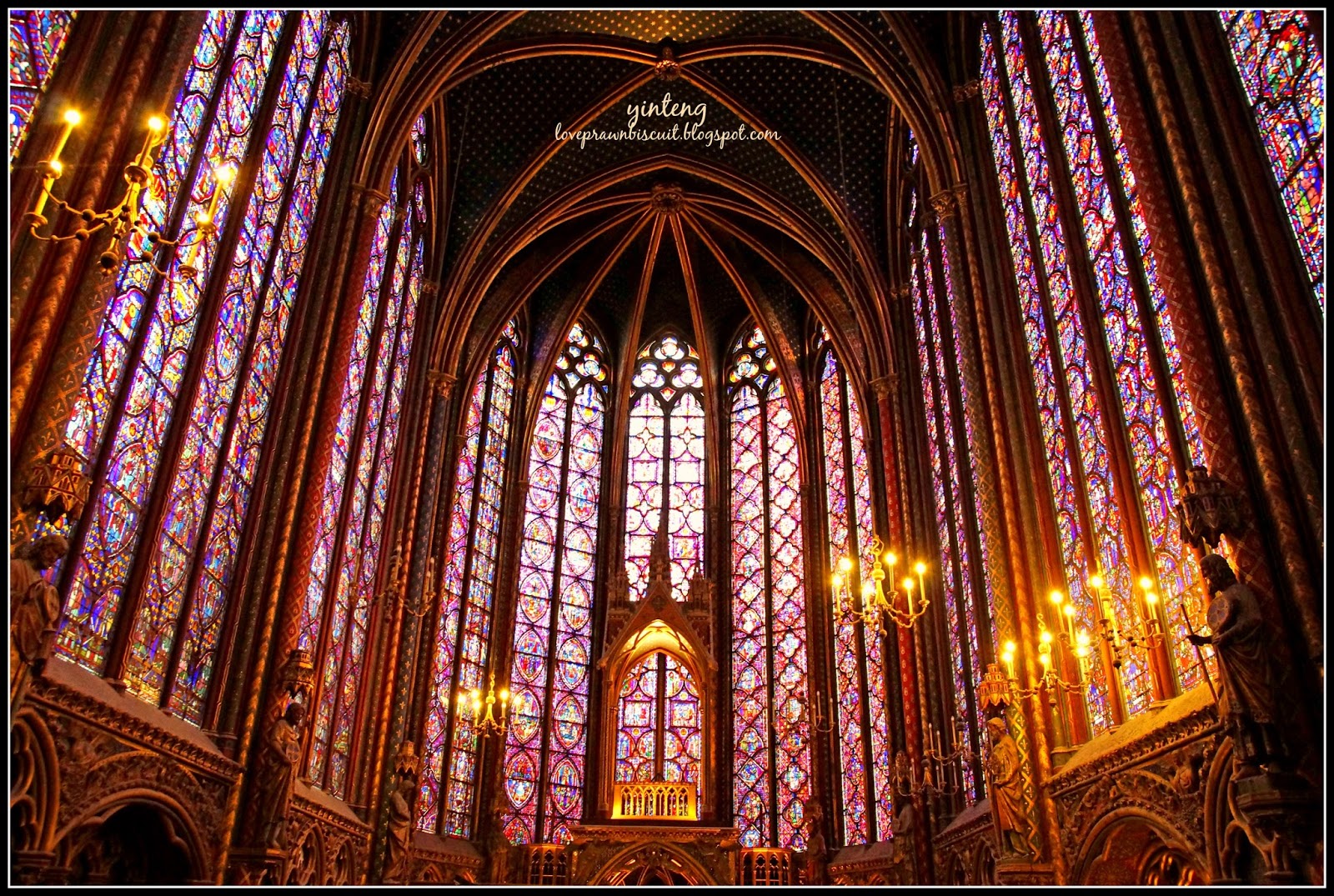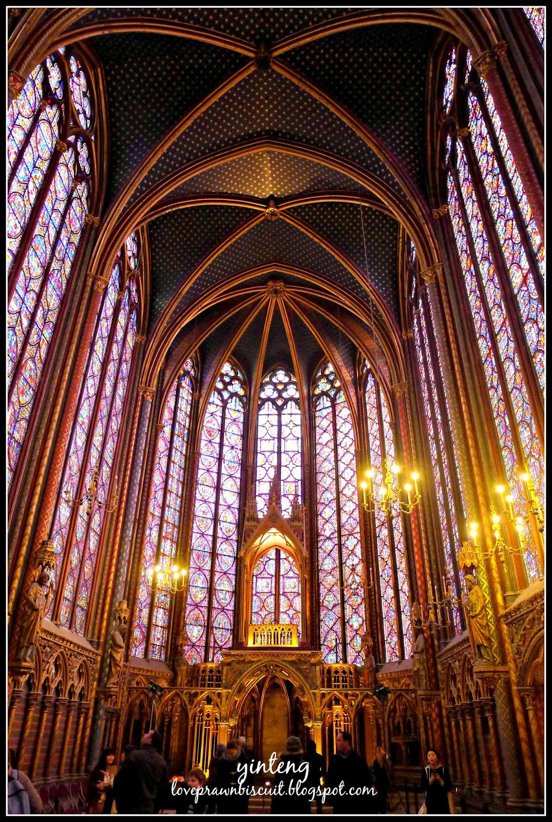 吃撑后,虽然圣礼拜堂还未到开馆时间,但秉持着"kiasu"(福建话,意为‘怕输’)的心态 ,我们就在告示牌后排起队了,我正好可以拿出早前买的书装文青一下。终于等到开馆了,这里人流控制相当严格,只让一定数目的人进去,然后要经过重重安检(温馨提醒:金属利具如刀子、剪刀皆不得带入),才得以买入门票(欧元八块半)进入礼拜堂。底层平平无奇,里头正在进行一些维修工作,以及摆了一排售卖纪念品的摊子。跟着箭头找到了楼梯,是那种漩涡状一直转上去的楼梯——转的晕头转向地,到了上层,一踏出楼梯,不由得倒抽一口气:“哗~”