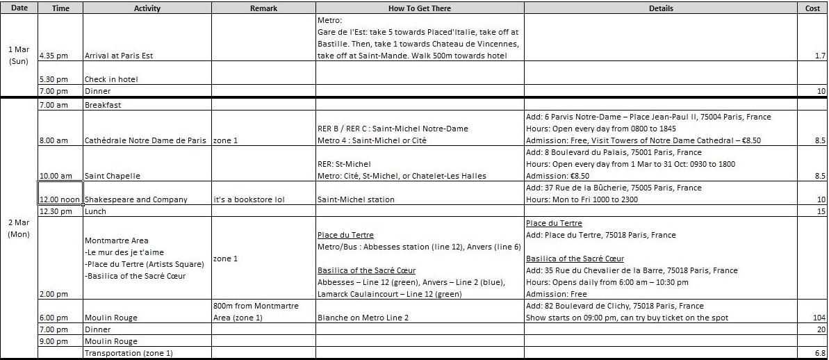 巴黎圣母院 (Cathédrale Notre-Dame)--> 爱情桥 (Pont de l’Archevêché) --> 莎翁书店 (Shakespeare and Company)--> 圣礼拜堂 (Sainte-Chapelle)--> 帖特广场 (Place du tertre) --> 圣心大教堂 (Sacré Coeur)--> 红磨坊 (Moulin Rouge)
