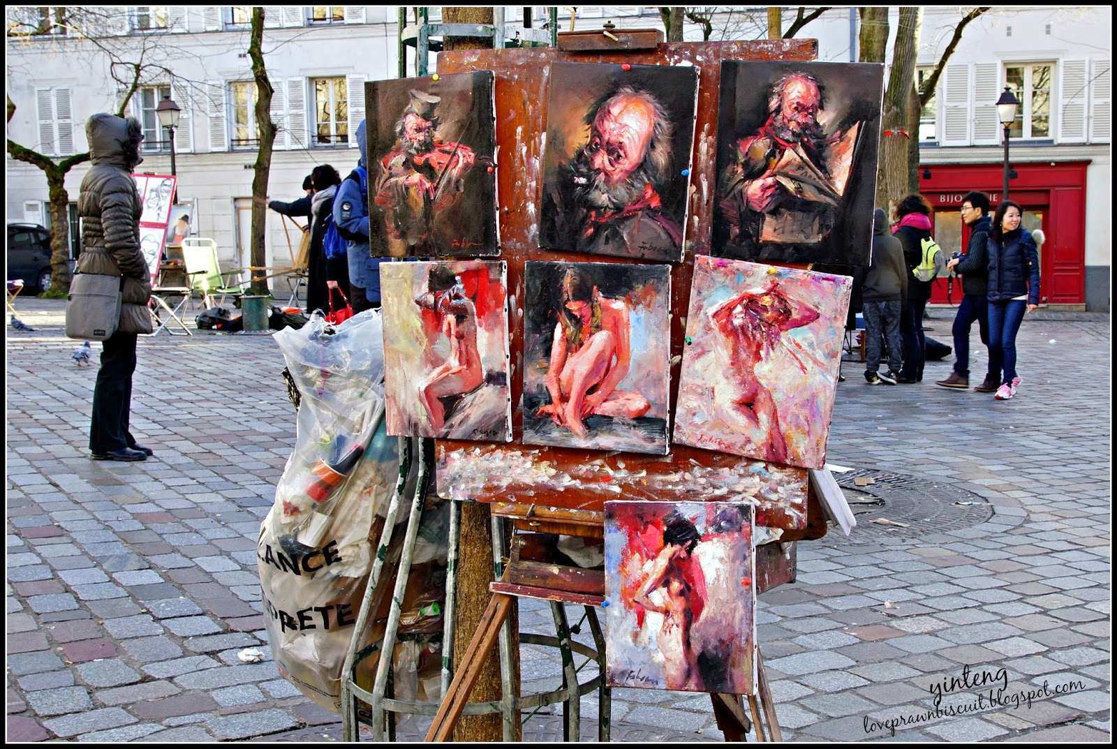 然后,我们走到了帖特广场 (Place du tertre),一个聚集了当地画家的露天广场。只见每个画家在凉飕飕的天气里光着双手(没戴手套真的会冻僵手指耶),握着画笔专注地在画板上涂画:有在描绘风景的,也有的在画人像。广场虽小,但各个画家各占一席地,加上围绕着广场四周的咖啡馆,形成了协调的画面。有的游人就坐在咖啡座啜着咖啡,看形形色色的行人,逛着广场的我们固然成了他们眼中的一道风景线,但他们何尝不是成为了我们眼中景色的一部分呢?
