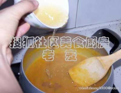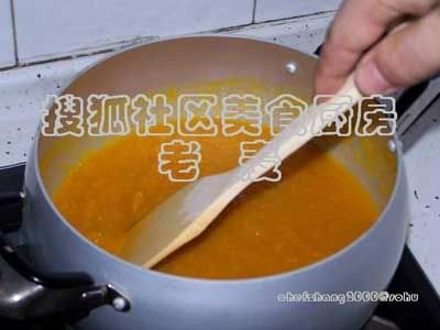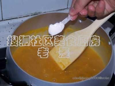 4) 奶以小火煮熱, 加入汁液內拌勻, 煮滾;