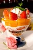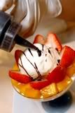 3.最後將士多啤梨鋪在杯邊, 放上雲呢拿雪糕, 淋上朱古力汁即成。