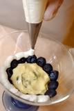 2. 將一半切好的雜果放在雪糕杯底, 鋪上少許忌廉乳酪, 然後將剩下的藍莓鋪在