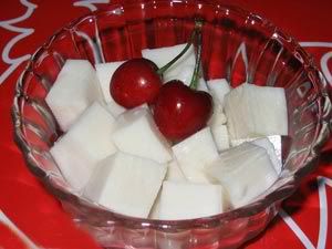 冷藏待用。藍莓一開為二、芒果及士多啤梨則切粒。