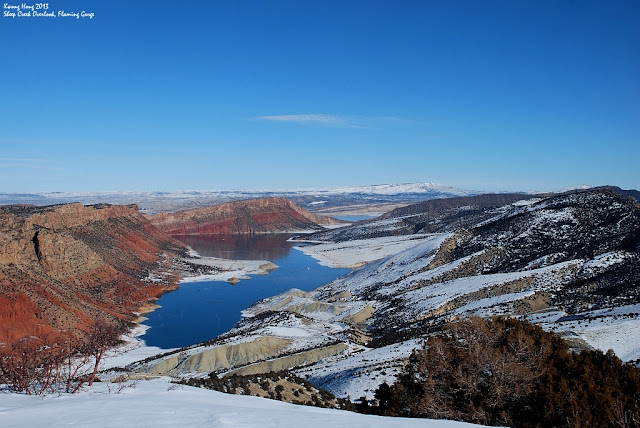 一路上的风景都是一样,近处是山,远处也是山。怀俄明州的山有很多都是荒山和岩石,加上层层积雪点缀下更是显得荒凉。可是这一山一石在我这个未曾见过荒山的外国人眼中都是特别的景色。见到想拍下的风景,我只需把车停在路边,好好欣赏一番。我沿着414号公路一直顺畅无阻地驾驶,路上遇见的动物恐怕比人还多。走着拍着,拐进了Flaming Gorge National Recreational Park的范围时,已经在车窗外遥远望见Green River,心里也开始亢奋起来。再开不久,到了一个叫Sheep Creek Overlook的高地,终于一见Flaming Gorge的真面目!Flaming Gorge名字的由来,是探险家Josh Wesley Powell在十九世纪的Green River探险时,发现像火烧一般的红色砂岩墙而得名。我一个人独占着Sheep Creek Overlook,这样冷的天气也没有多少游人,可那已是一月中气温比较高,也没什么风的好日子了。能见到Flaming Gorge这样的自然美景,加上层层积雪点缀冬天的景色,只能说太幸运了。