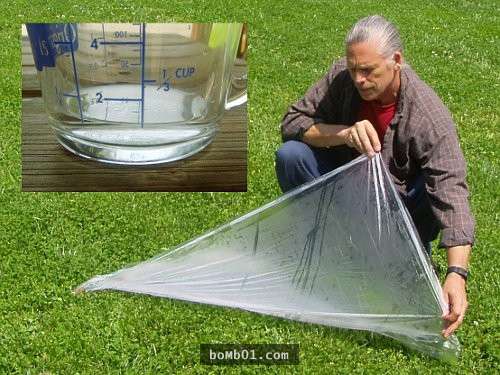 ▼4. 把保鲜膜铺在草地上,很快就能收集一些水分。