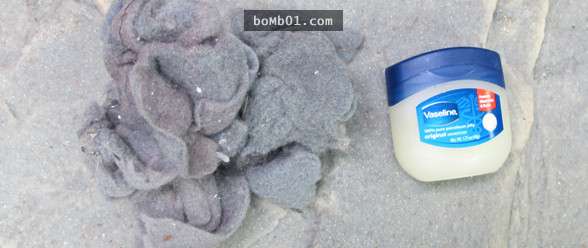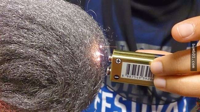 ▼10. 将钢丝绒和电池的正负极碰触,就能生火。