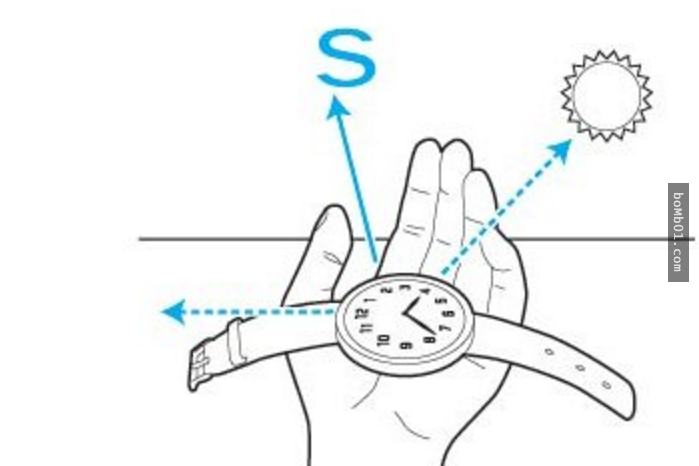 ▼16. 用手表辨别南方。 将12点钟向著左边,然后12点钟和时针的中间位置对著的方向就是南方。