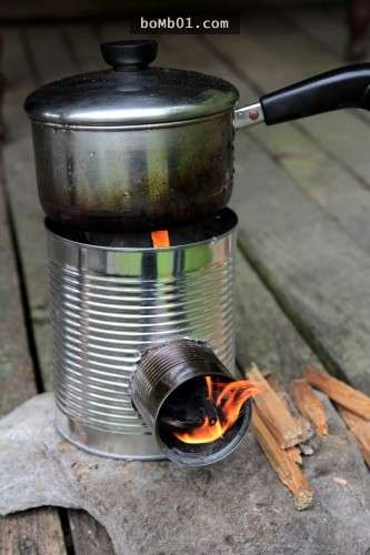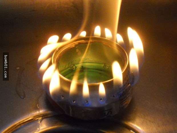 ▼18. 将饮料罐的上下两部分切割下来,在上班部分周围钻孔,交叠起来后倒入酒精,点燃当成小炉子。