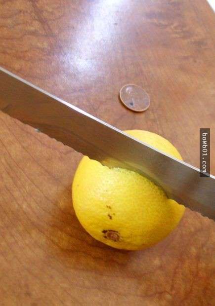 ▼8. 柠檬和硬币。在柠檬上切两条缝隙,放上硬币,用电线连接起来就能发电。