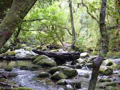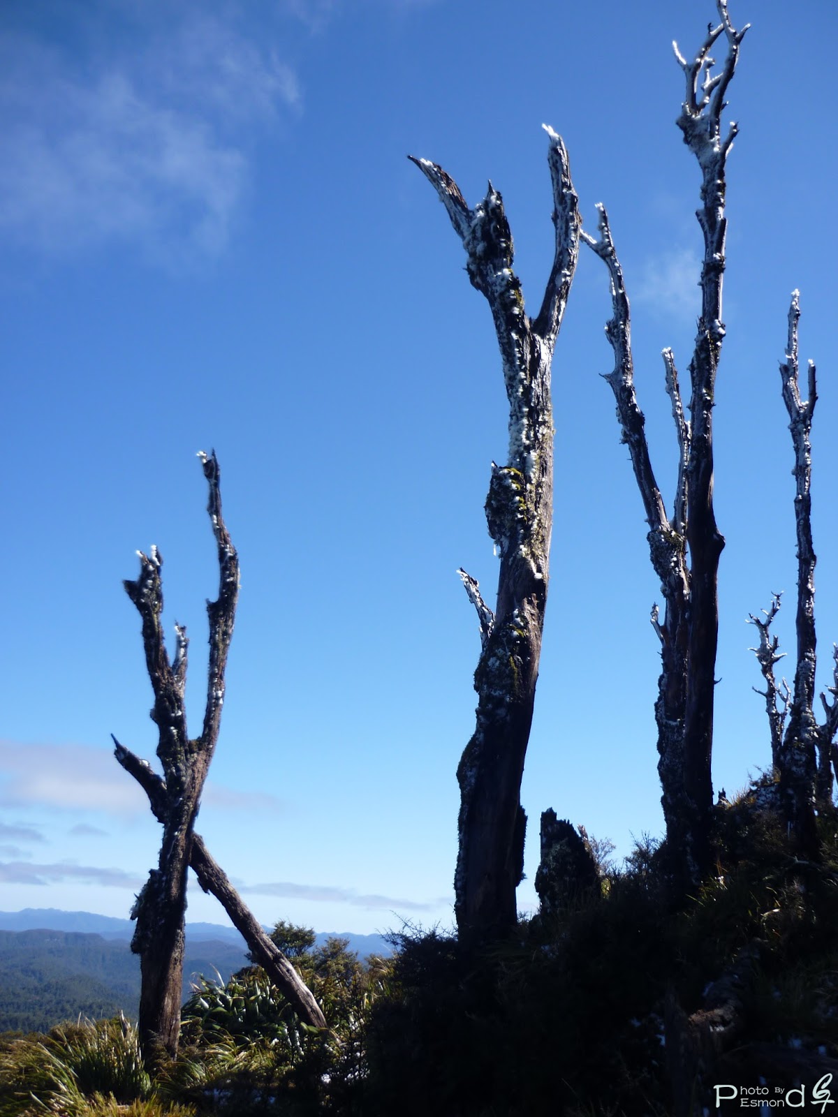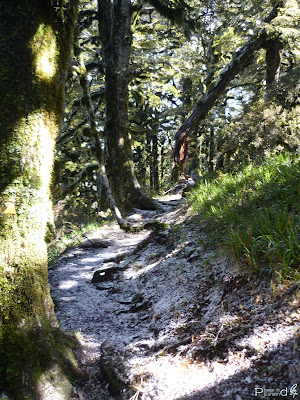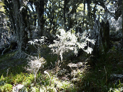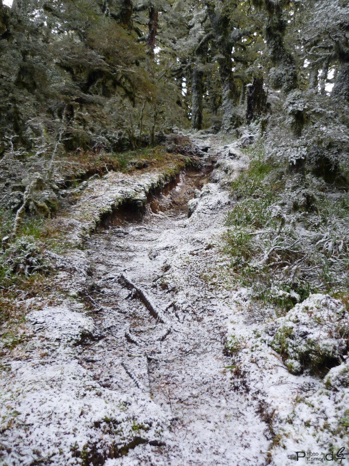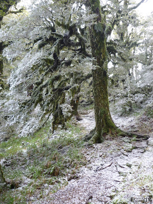走到中午时分时,一直乌云满天的天空终于回复纽西兰最漂亮的颜色--一片蓝蓝色的天空!!!看着蓝蓝色的天空,心情顿时也好了不少。由于天气转晴,树枝上的积雪和冰就融化的更快,每当走过一片类似的树林,我就需要冒着水滴前进,就好像在雨天赶路似的。。。纳闷啊。。。