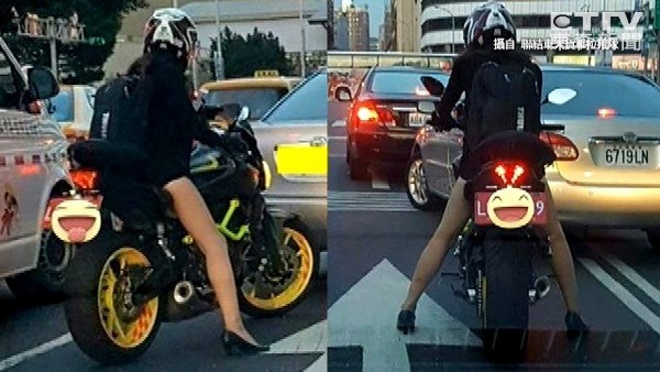 ▲穿短裙配高跟鞋,女跨騎重機好吸「睛」。