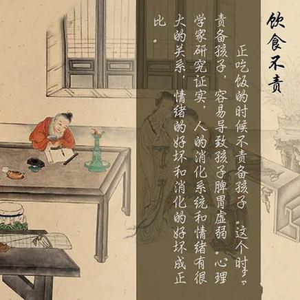 4、饮食不责: 正吃饭的时候不要责备孩子。 这个时候责备孩子,很容易导致孩子脾胃虚弱。