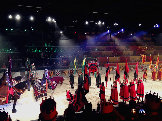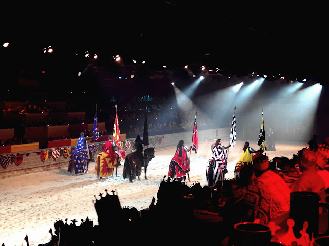 抵达中世纪城堡,人山人海的情景,我们就直接走到柜台处索取门票。这场晚餐秀我们免去了$62.95入场费用,所以一个人仅需付$25的晚餐费用。 一进门后,一身中世纪打扮的员工给我们分发每人一顶皇冠,然后主动要求帮我们合照。表演结束以后,你会在另一端看见你所拍的照片已经冲洗好了,喜欢的话可以购买。天下没有白吃的午餐,照片可不是免费的。 Li Sin 在途中告诉我们说道 “Medieval Times”,以前的人吃饭都没用餐具,叮咛我们做好心理准备用手吃晚餐,我们突然愣了真的假的? 员工带领我们到已分配好的座位,眼前的就是已摆设好的碗碟,果真就是不见刀具! 那么我们就入乡随俗好好享受当晚十一世纪国王的盛宴。 宴会会盛上番茄浓汤、大蒜面包、半只烤鸡、烤马铃薯、甜黍还有甜点和一杯饮品。 分量好大,那半只烤鸡我都已经饱到头顶,不想浪费剩余的食物所以决定打包回家当明早的早餐。 一边享用我们的晚宴一边目睹六位骑士之间的对决。忘了提及这一点,当我们就坐在分配好的桌位时,就代表着我们是其中一名骑士的后备团,无时无刻为骑士加油给予力量! 现场惊险刺激的竞技比赛,剑斗表演,马术和训鹰表演赢得宾客们的喝彩欢呼。