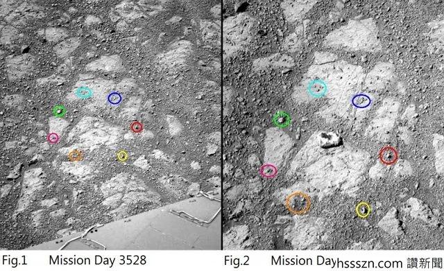 13.这两张照片是火星车(在火星登陆用于火星探测的可移动探测器)所拍摄,第一张是第3528天任务的照片,第二张是3540天的照片,两张只相差12天的时间。在第二张中,有一块石头出现在岩层中央,没有人可以解释这到底是什么原因。