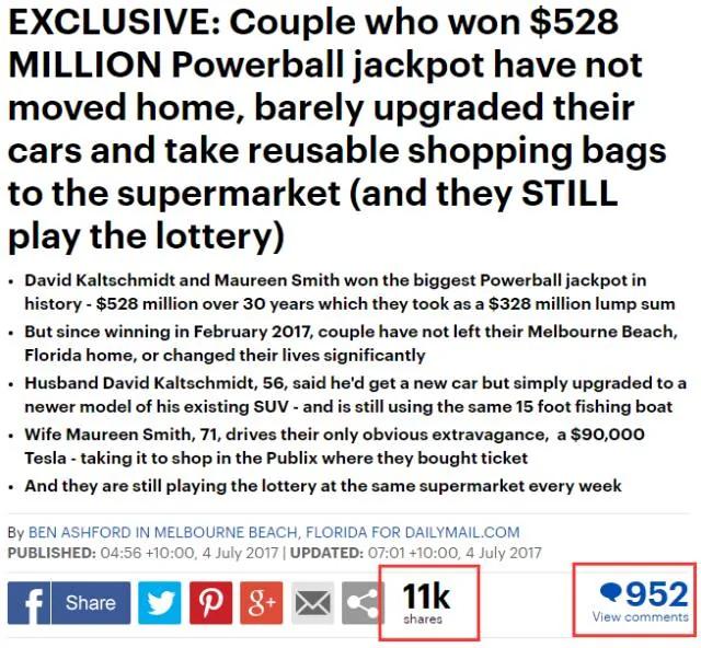 《每日邮报》的记者也是无奈了,报道了这么多彩票中奖者,那么多百万千万富翁,而你们这个亿万富翁的画风,真是最清奇的…… 报道一出,世界震惊! 《每日报道》的记者,把这次的收获,写成了新闻,发布在网站上。 本以为夫妻这么平淡的生活会石沉大海, 没想到的是, 这个新闻瞬间就火炸了!! 转发11000次, 评论近千条!!