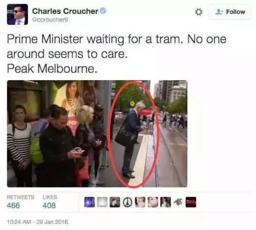 在6月28日早上,澳洲总理谭保(Malcolm Turnbull)在墨尔本坐电车,坐在他对面的女子都没抬头看他一眼。谭保几次微笑示意,然而,对面的女子依然纹丝不动,继续看着手机。