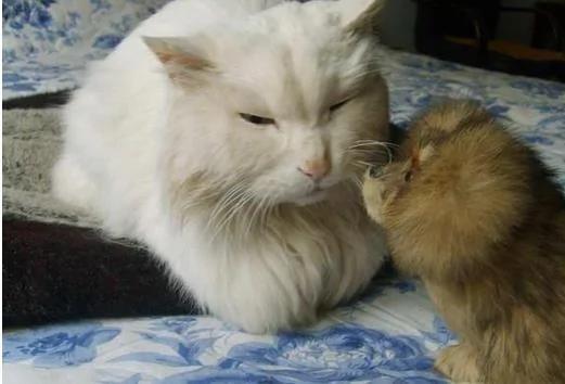 猫咪越来越没精神了,为了逗它开心,把它平时喜欢的小狗放它旁边逗它玩。小狗有时像是与猫咪私语,有时又像是与猫咪接吻。