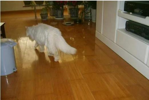 阳光透过窗户洒在客厅的地板上,几天没有进食的猫咪看到阳光一下子来了精神。它向窗台走去。
