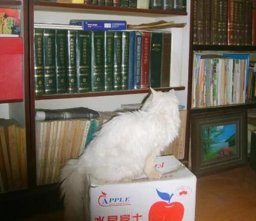 猫咪平日是难得进书房的,主人怕它在书脊上磨爪子,不让它进。有时书房门开着没有人,它也会趁机溜进去看看。现在主人也对它敞开房门了。它趴在纸箱上,扭头看书架上的书。纸箱是它平时最喜欢磨爪子的地方,今天却舍不得下爪子,也没有力气磨了,卧上去久久舍不得下来。