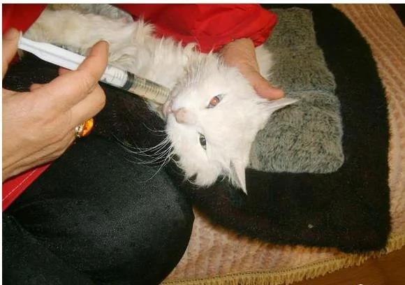 猫咪已经不会自己喝水,从昨天夜里开始,主人就用针管给它往嘴里注葡萄糖了。