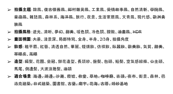 另外再針對我特別喜歡的風格尋找相關場景,並提供更多 關鍵字 給攝影師參考。