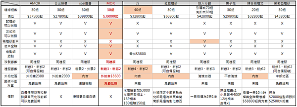 為了寫好這篇文章,我還是在每天下班排滿了門市預約,就算有朋友的真心不騙,也還是要參考參考其他家。 murmur:原來我默默跑了這麼多家 表格看下來,MOR的價位不是最低的,甚至外拍車的加價也是最高的,但爬文比較完大家拍出來的成果後,還是MOR最受我們的青睞~ Angely諮詢心得: 第一家諮詢的sosi,之所以讓我卻步,除了價位偏高、禮服要自取自還外,最重要的是遇到不好的天氣,居然 不能免費延期 …也一定要送我一幅我 租屋處根本放不下 的油畫框...實在是大大打擊了我,只好含淚劃掉。