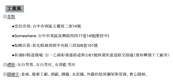 【 拍攝場景 】 棚內:水泥牆、木紋牆、復古燈架 棚外:秘密基地→忠信市場→九天黑森林 Angely碎碎念:在12/1溝通這天,本來一心一意想要回高中母校拍攝,但礙於必須假日拍攝,會因此放棄更多景點,在楊先生的同意下,直接砍掉所有彰化的場景,回到平日的台中拍攝。