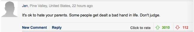 “每个人都有憎恨自己父母的权利,生活确实有不如人意的一面,当别人做出这样的决定,是我们不要妄自判断。”