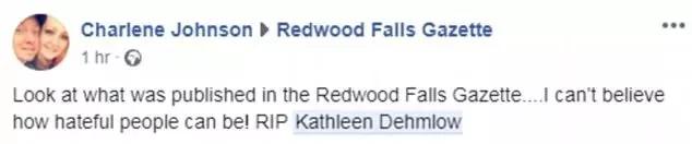 Kathleen Dehmlow于2018年5月31日去世。他不会被他的两个孩子所怀念。因为他们知道,这个世界上少了这个女人会变得更好。”