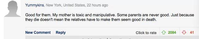 “我觉得他们做的没有错,我自己的母亲就非常有毒,并且操控欲很强,有些父母一直不知道如何尽到自己的责任。不能因为他们死了,我们就必须要承认他们做得好。”